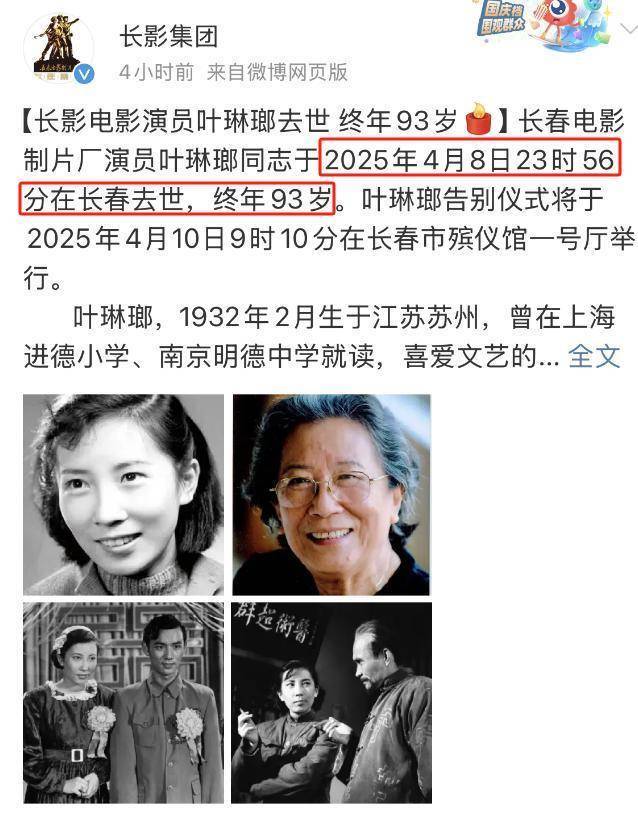 人生无常,2025年4月8日23时56左右,长春电影制片突然发布讣告。称著名演员叶琳瑯于4月8日晚11点56分在长春因病离世,享年93岁。
